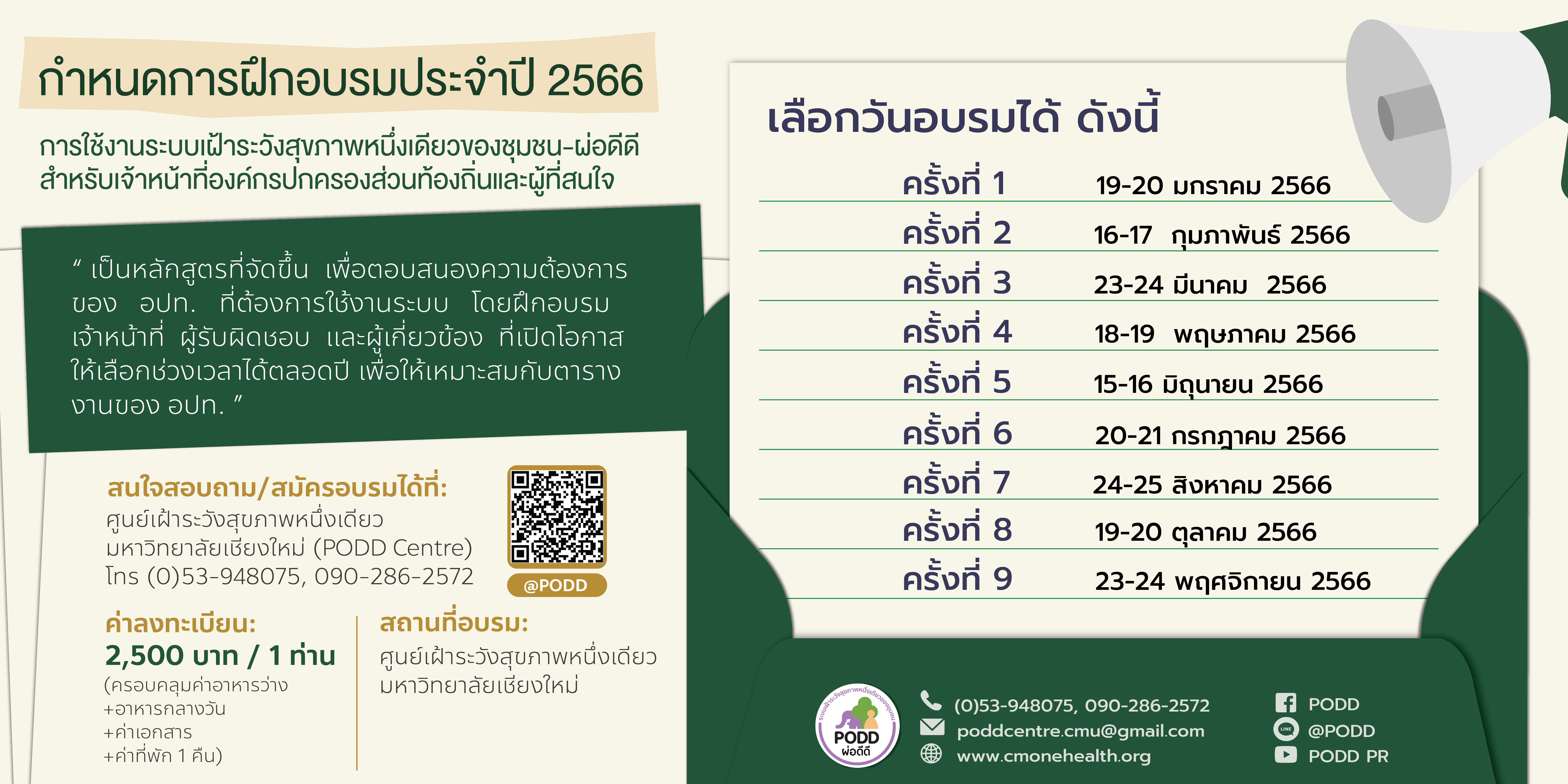 สนใจสอบถาม/สมัครอบรมได้ที่ : ศูนย์เฝ้าระวังสุขภาพหนึ่งเดียว มหาวิทยาลัยเชียงใหม่ (PODD Centre) โทร (0)53-948075,090-286-2572